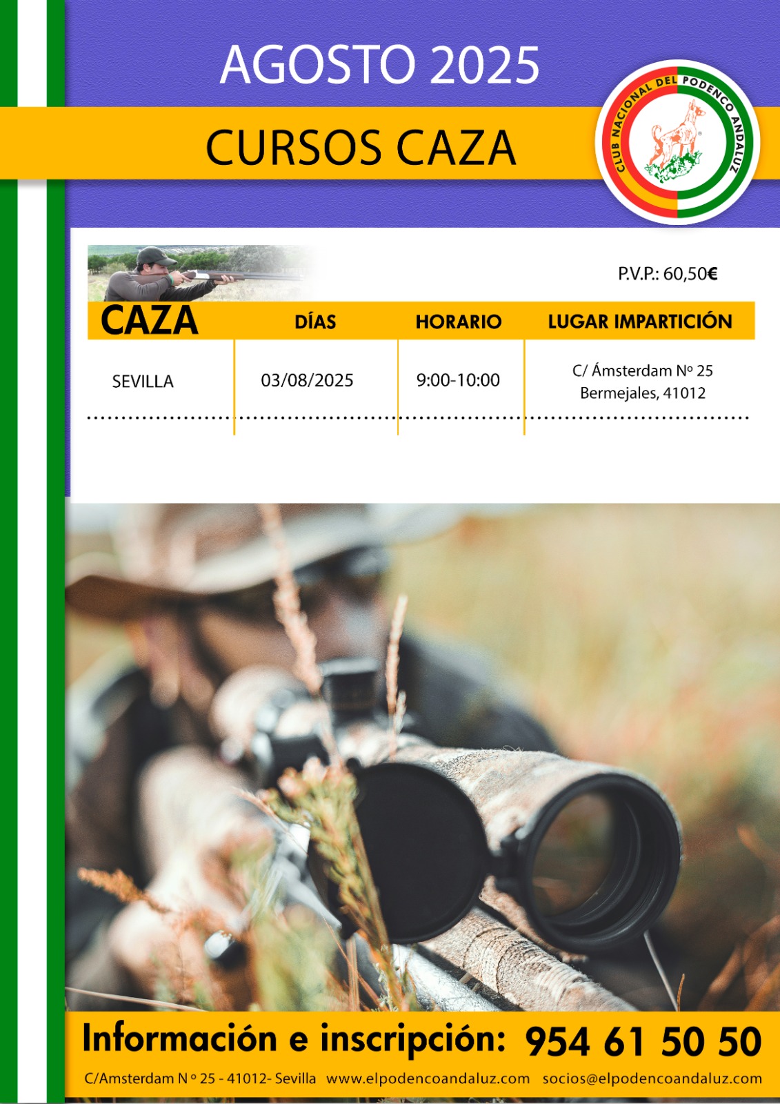 Si deseas cazar legalmente en Andalucía y no dispones de Licencia homologada por la Consejería de Medio Ambiente de la Junta de Andalucía, ahora con el Club Nacional del Podenco Andaluz, a través de su departamento de formación ( cursos de caza y pesca en Sevilla ) podrrás homologar la licencia de tu Comunidad con la de Andalucía.